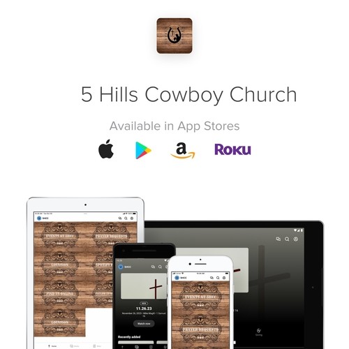 We're excited to announce the launch of our app designed to bring our 5 Hills Cowboy Church community closer together and enrich your spiritual journey like never before! Available on iOS and Android phones, as well as Roku and Amazon devices, our app offers a variety of features: